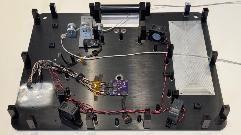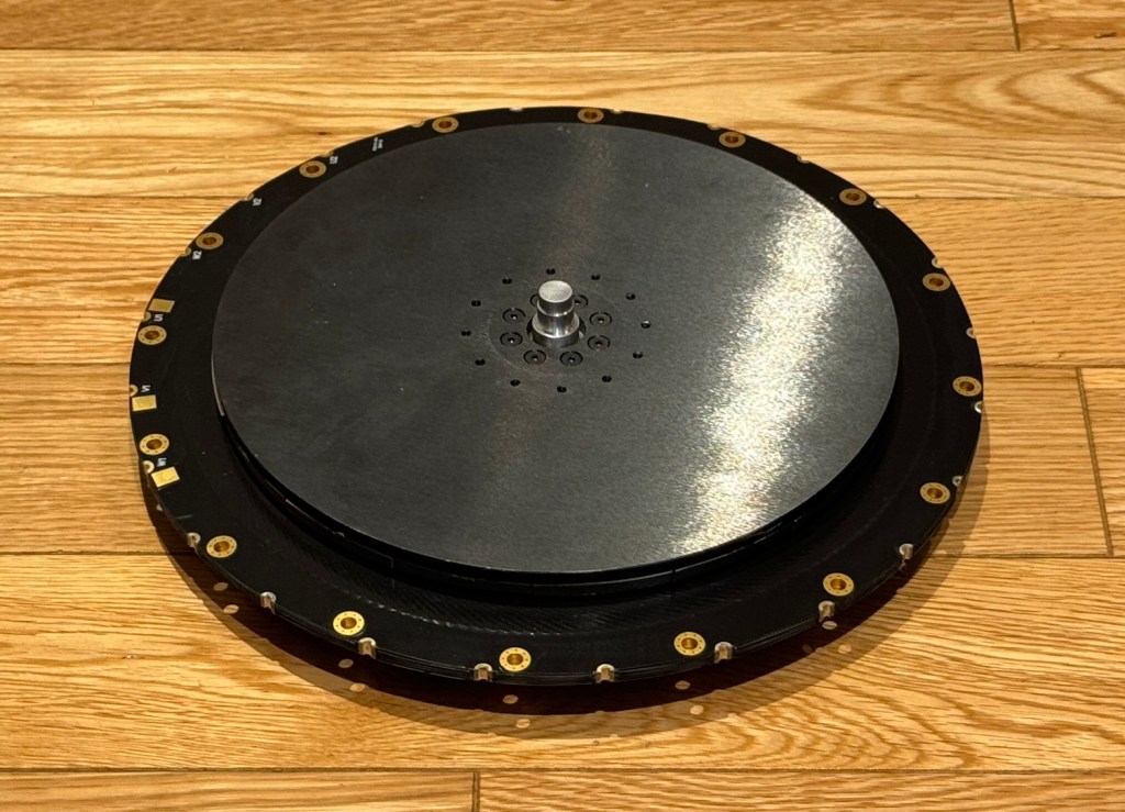 The printed circuit board (PCB) stator windings, with the rotor magnets on either side, allow for a slotless motor design, providing smooth motion.